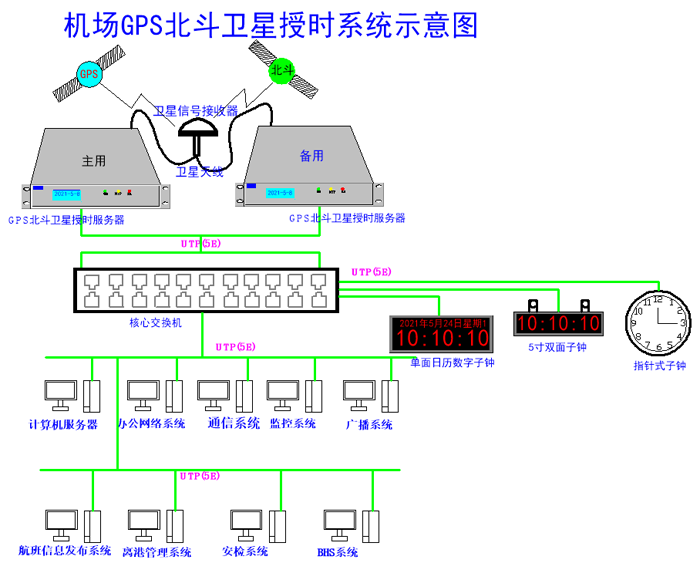 標(biāo)準(zhǔn)的時(shí)間系統(tǒng)是機(jī)場、航站樓等信息化的重要的組成部分,利用GPS/北斗衛(wèi)星時(shí)間信號(hào)為機(jī)場航站樓各業(yè)務(wù)流程和行政部門的工作有序、順利開展,提供統(tǒng)一標(biāo)準(zhǔn)、統(tǒng)一的時(shí)間信息,意義重大,其主要作用: